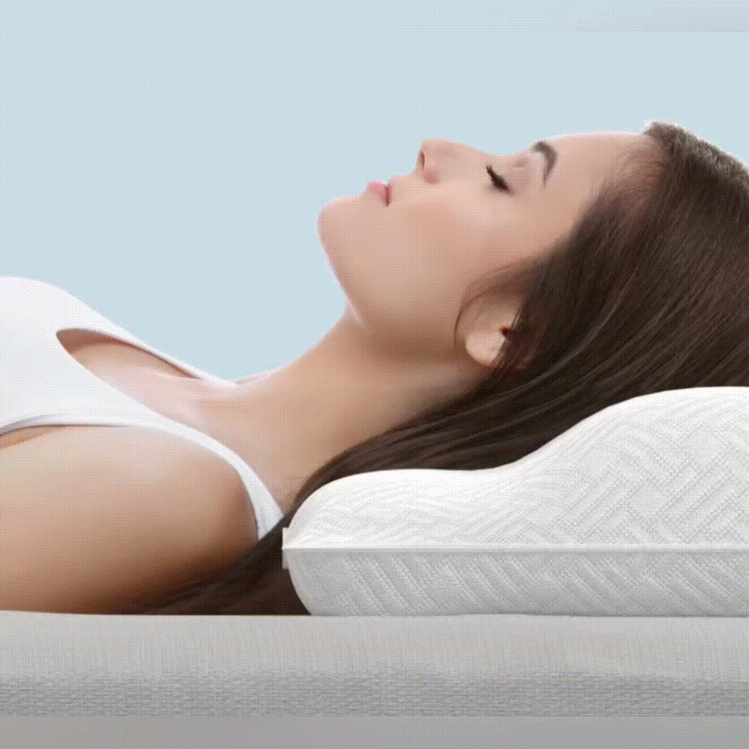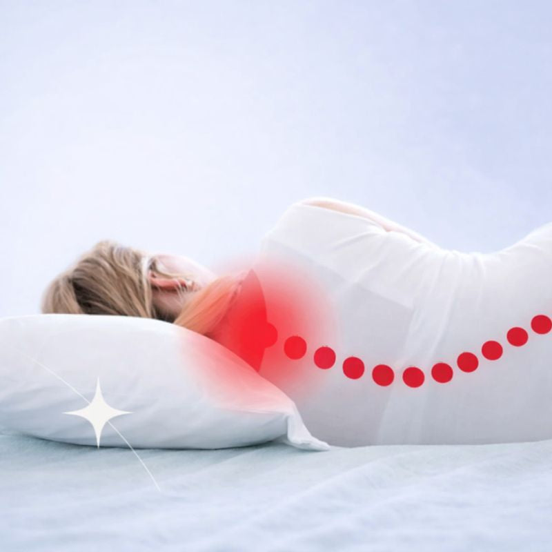 An ergonomic pillow helps support the neck and upper body in a more balanced sleeping position.